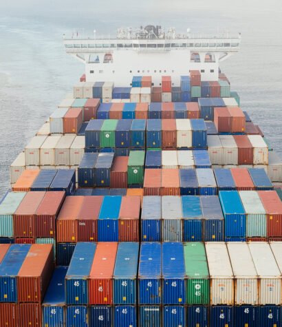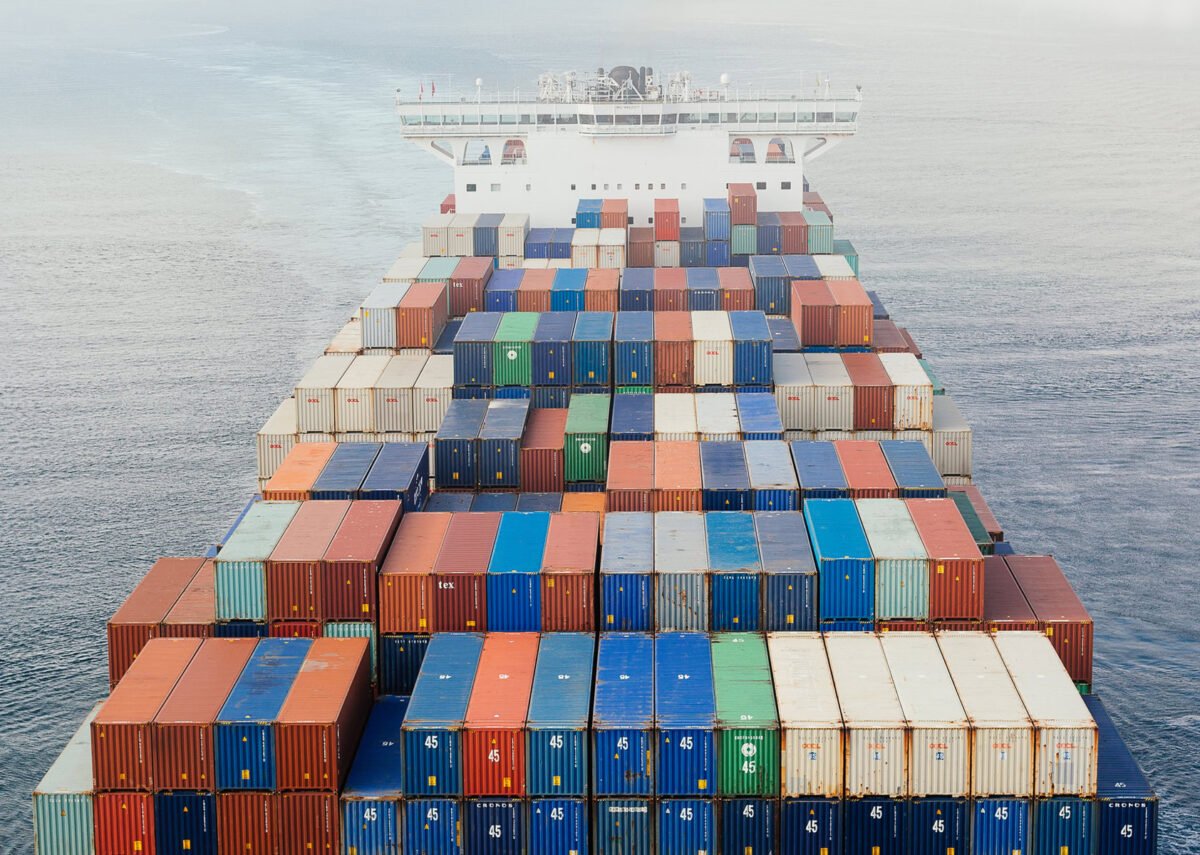 Witness global trade in motion as a mighty cargo ship navigates the vast ocean, symbolizing the interconnectedness of our world.